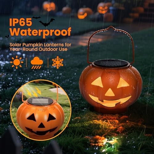 Halloween Pumpkin Solar Lanterns – Jack O Lantern Hanging Solar Light Waterproof for Yard, Patio, Garden,Spooky Decor Halloween Party Decorations